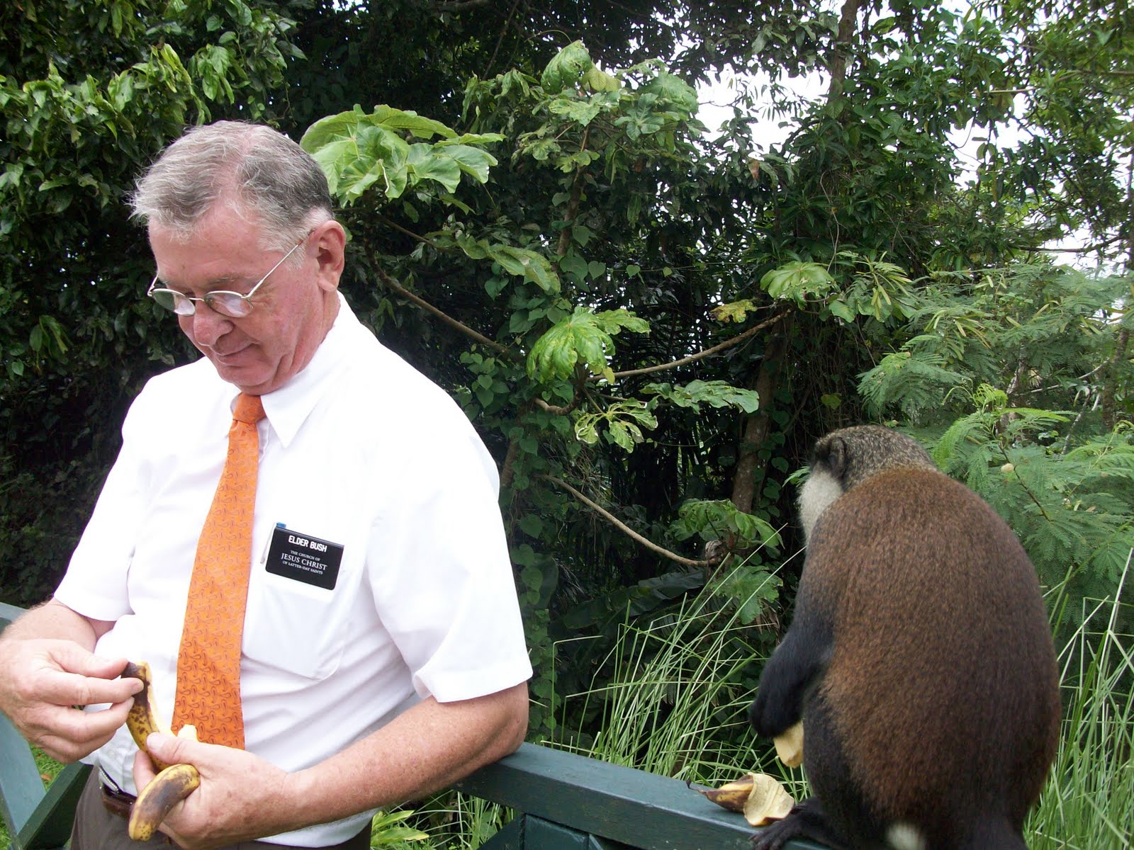 Bob feeds a piece of the banana to the little primate.